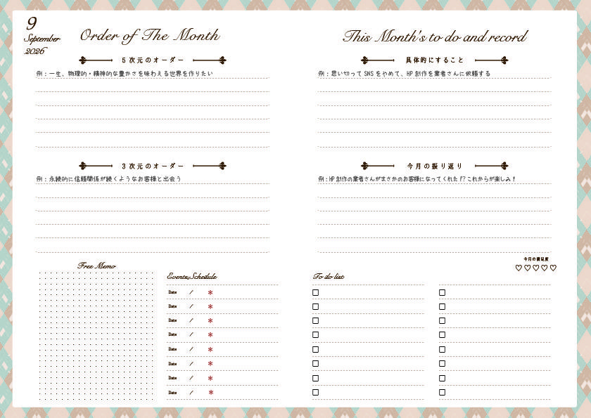 月ごとにメモが出来るフリーノートページが8Pとたっぷり設けられており、
